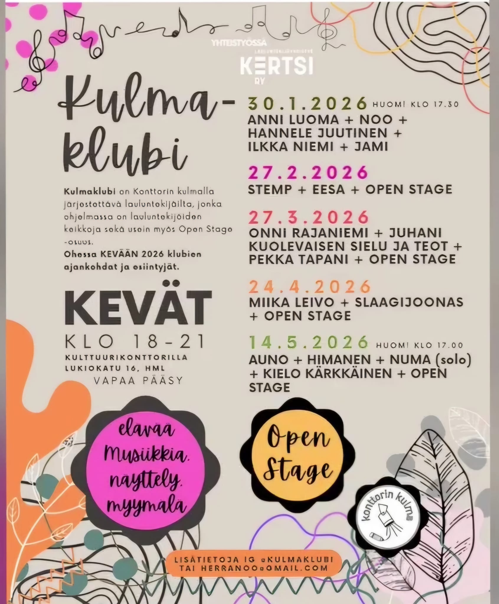 Kaikissa asioissa tavoitat meidät parhaiten Kulttuurikonttori(@)gmail.com -osoitteesta